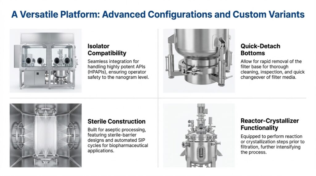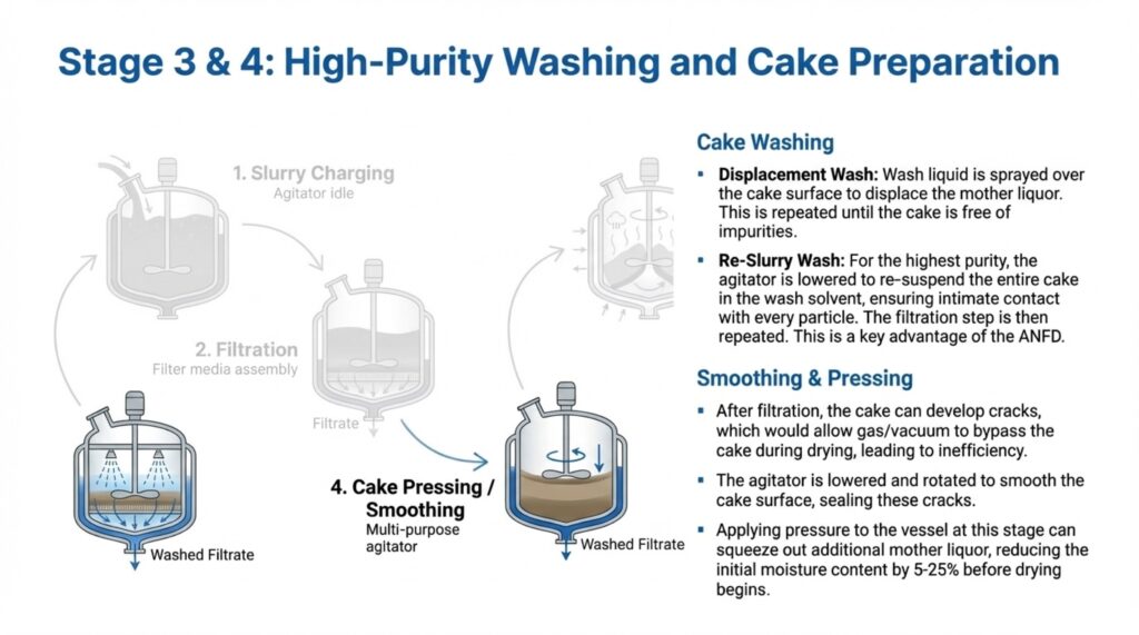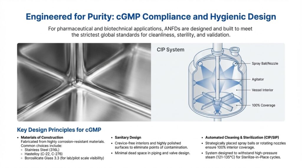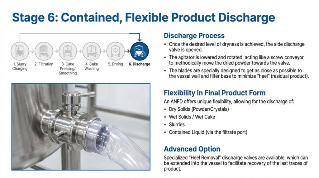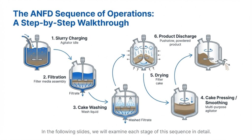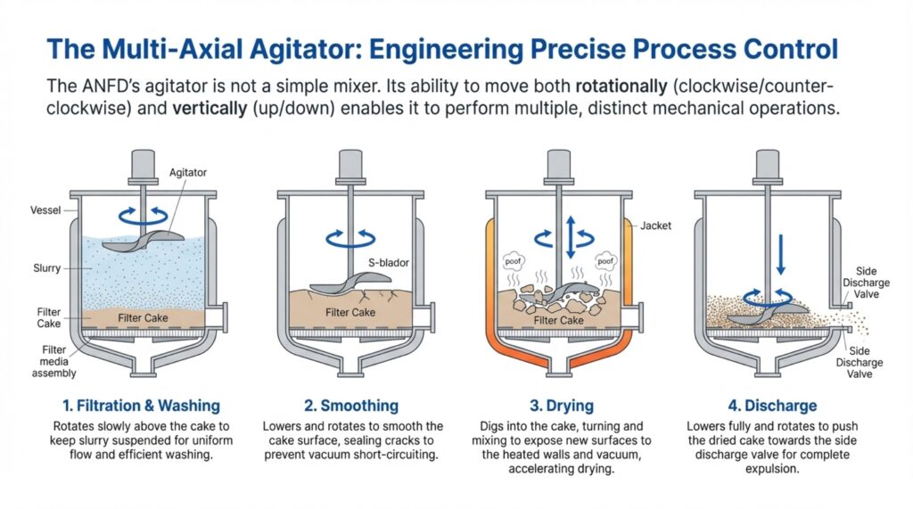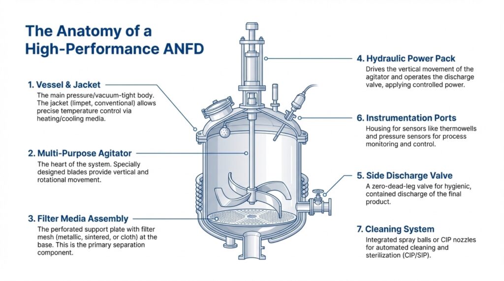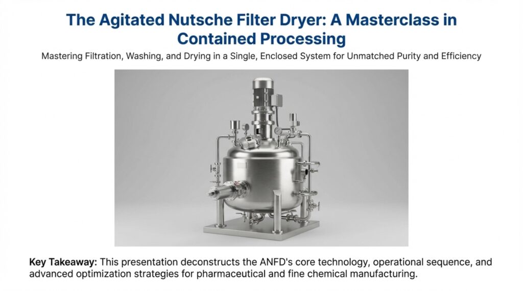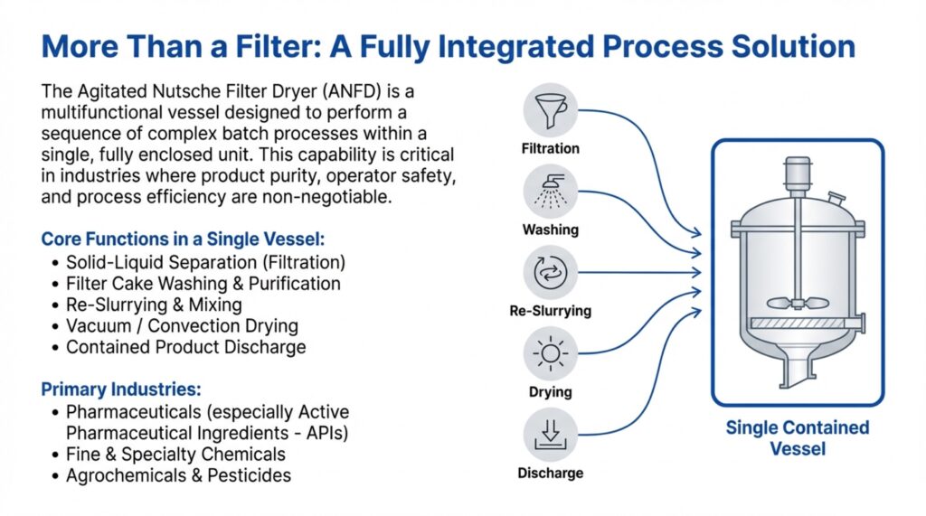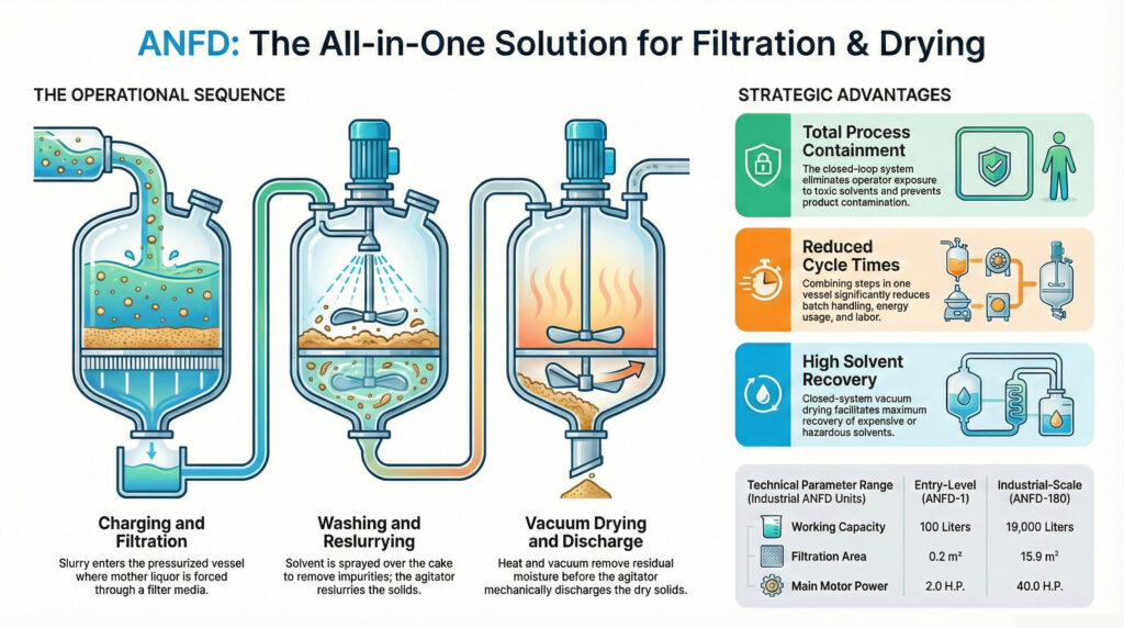 The Agitated Nutsche Filter Dryer (ANFD) is a multi-functional, fully enclosed vessel designed to perform solid-liquid separation and drying in a single equipment. These systems are essential for industries such as pharmaceuticals, fine chemicals, and specialty chemicals, where they allow for complex batch processes like filtration, cake washing, and re-slurrying to occur sequentially. By combining operations into one unit, manufacturers can minimize product handling and operator exposure, which is critical when dealing with toxic or sensitive active pharmaceutical ingredients (APIs). The sources describe this equipment as an advanced solution engineered for excellence, reliability, and containment.