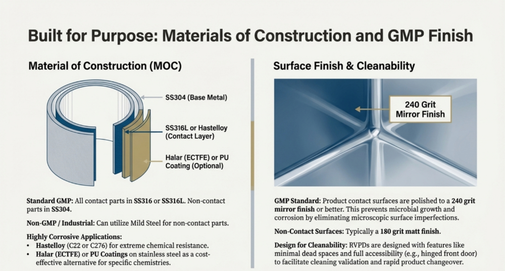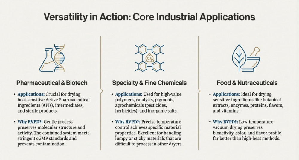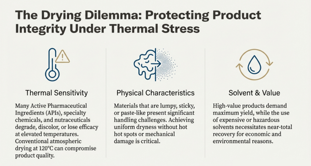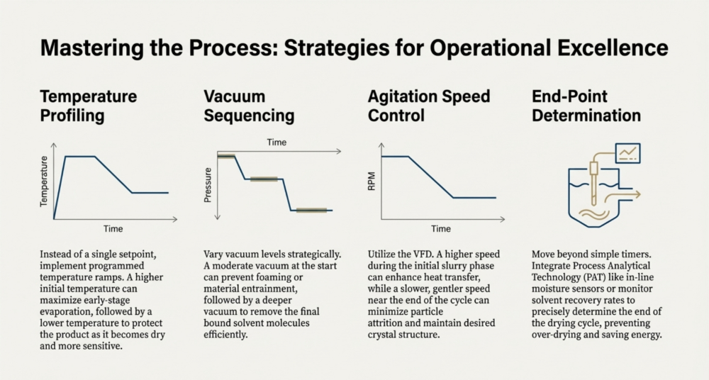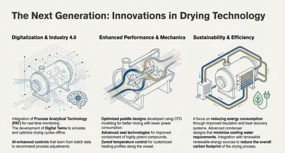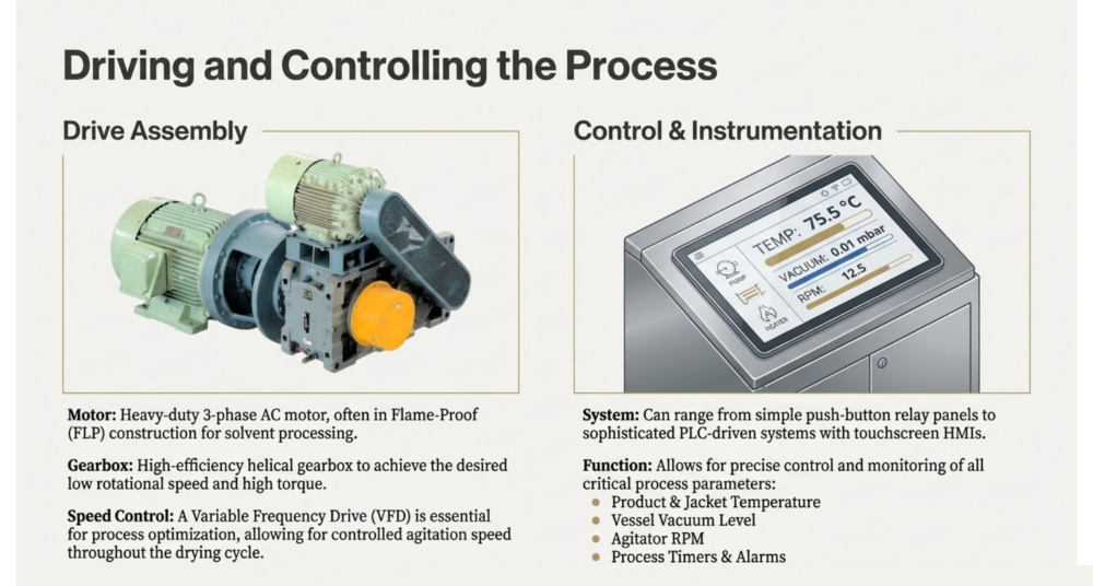 To ensure operational efficiency and product recovery, these primary utilities are supported by critical accessories like the dust catcher and advanced control systems. The dust catcher, often a jacketed filter housing mounted on top of the vessel, arrests airborne powder particles to prevent them from entering the vacuum system, frequently utilizing nitrogen pulsation to return the product directly to the dryer,,. The entire process is managed by an operating panel—typically housing Variable Frequency Drives (VFDs) and PLC-driven touch screens—which is often located in a separate “utility section area” to maintain safety and hygiene standards while precisely regulating agitation speeds and temperature profiles,.