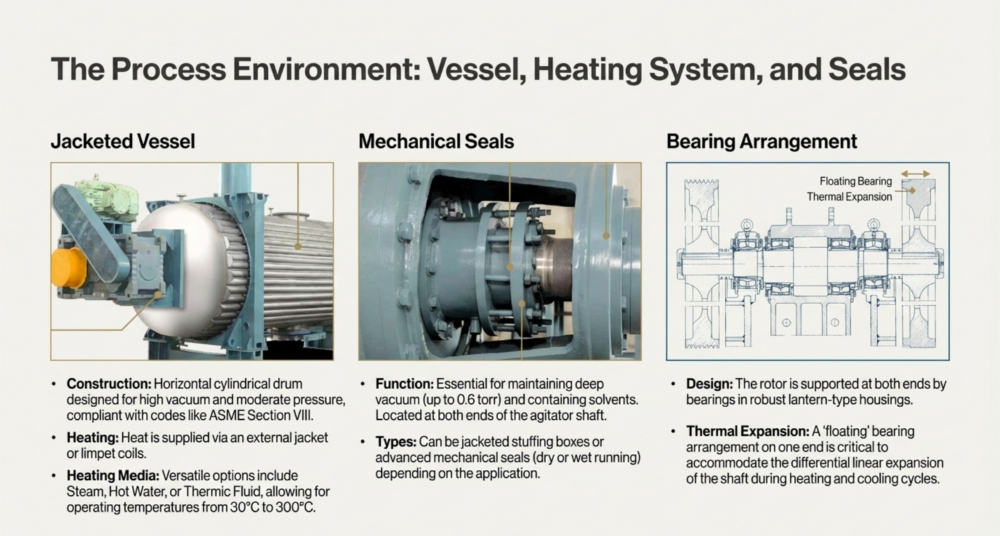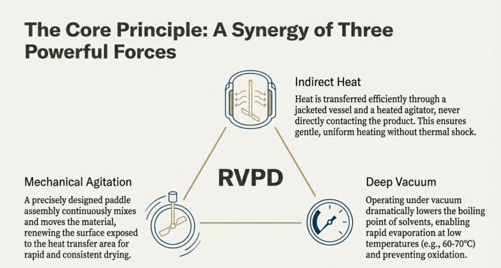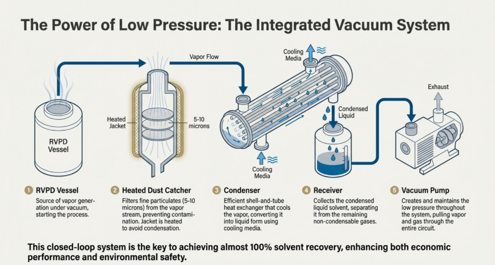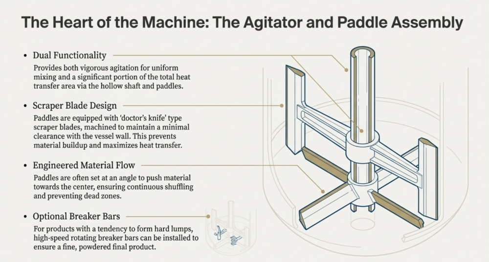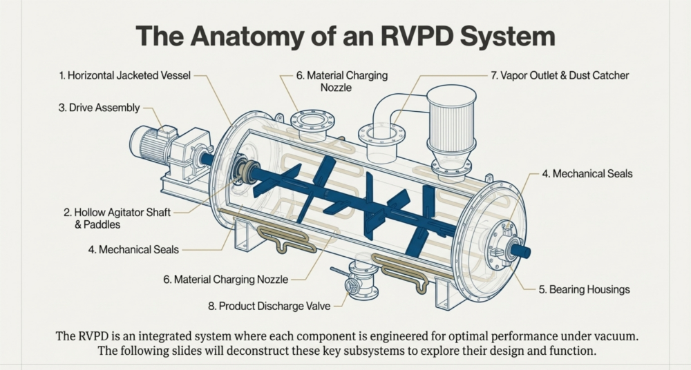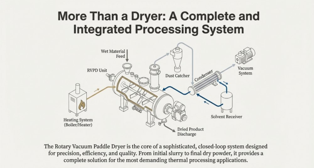 The ancillary and utility systems act as the essential life support for the Rotary Vacuum Paddle Dryer (RVPD), creating the specific environmental conditions required for efficient drying. The vacuum system is typically described as the “heart of the system,” comprising a vacuum pump (such as a water ring, oil seal, or screw pump), a shell and tube condenser, and a receiver to lower the boiling point of solvents, thereby enabling gentle drying at reduced temperatures,,. Simultaneously, the heating utility circulates thermal media—such as steam, hot water, or thermic fluid—through the vessel’s jacket, limpet coils, and hollow agitator shaft to provide indirect heat transfer, with fuel options ranging from natural gas to electricity depending on availability,,,.